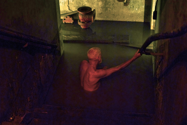 For this durational performance, Johannes submerged himself in the dirty water that had flooded the basement of an abandoned warehouse. For three hours he walked back and forth between the basement and the main floor where he scrapped off the water that had accumulated on his body. This water was dripped onto clothing spread around a vessel of clean water. Occasionally he would take a drink from. The action concluded with him washing himself with this water.